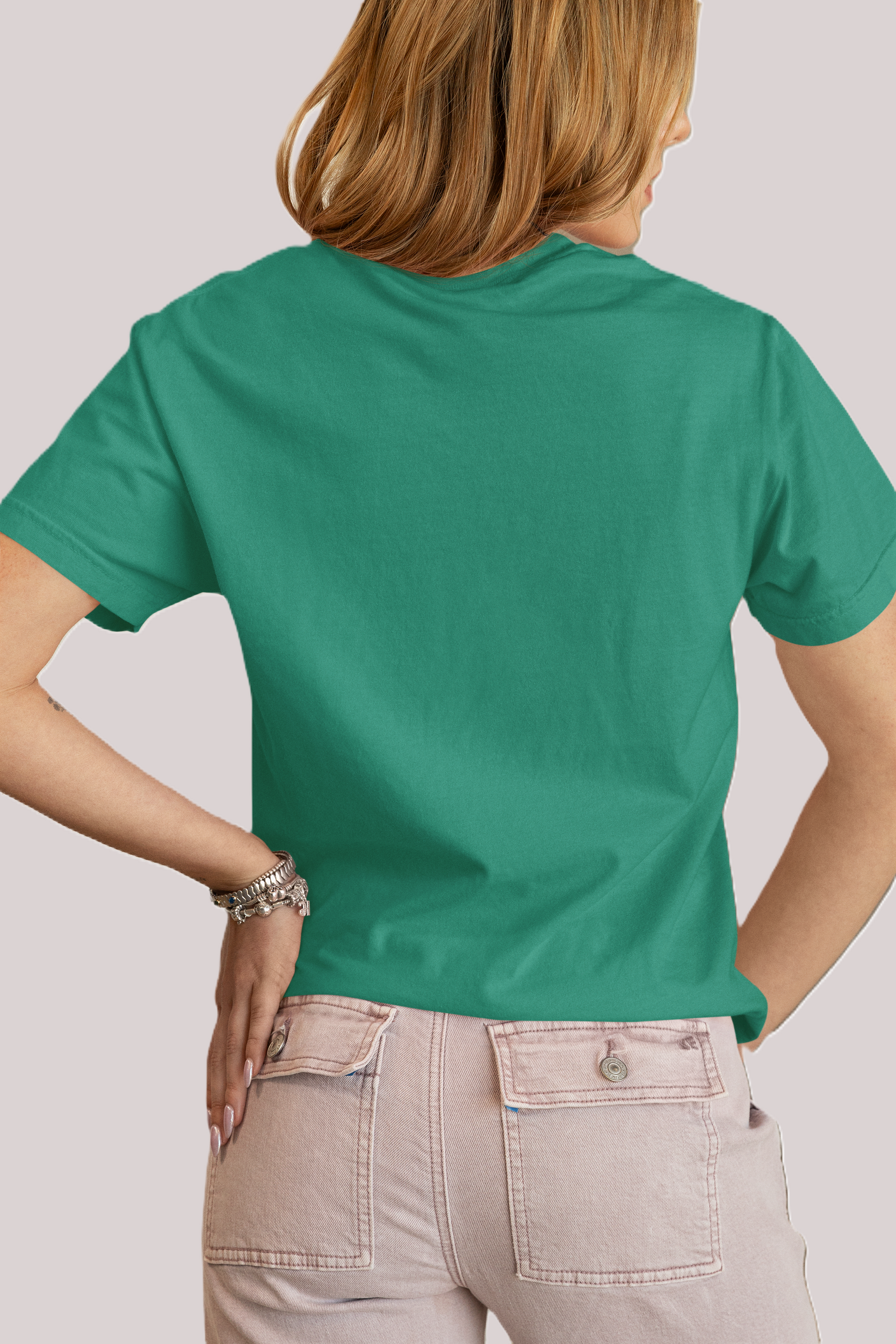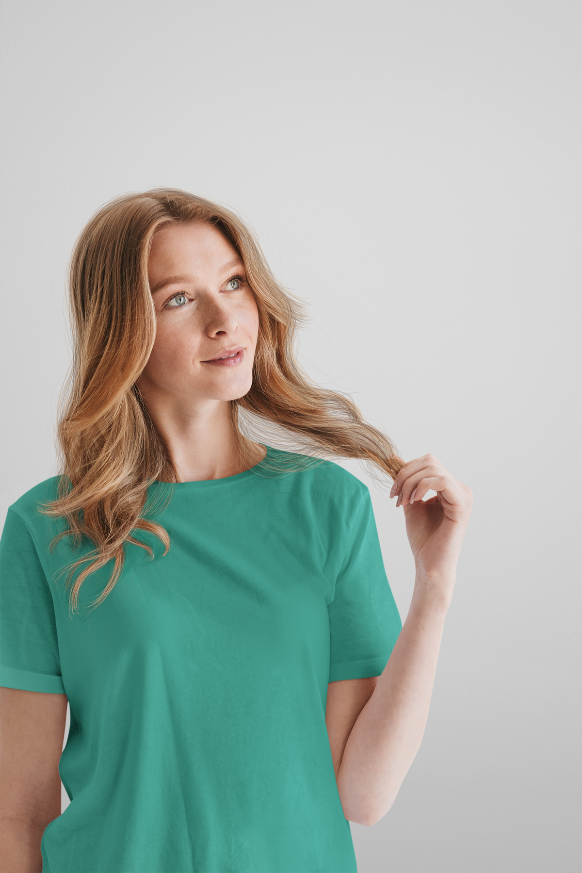 This premium Saga green T-shirt offers women a versatile wardrobe essential with a flattering regular fit. Crafted from high-quality fabric that maintains its shape and color through multiple washes, it provides both comfort and durability for everyday wear. The rich green hue complements various skin tones and pairs effortlessly with jeans, skirts, or layered under jackets.
